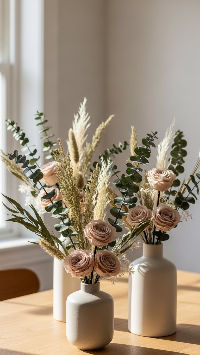 If you like the low-effort charm of wreaths, preserved floral arrangements give that same seasonal feel with far less maintenance. You’ll choose neutral palettes, pairing dried eucalyptus with muted grasses and preserved roses for sculptural, long-lasting centerpieces.