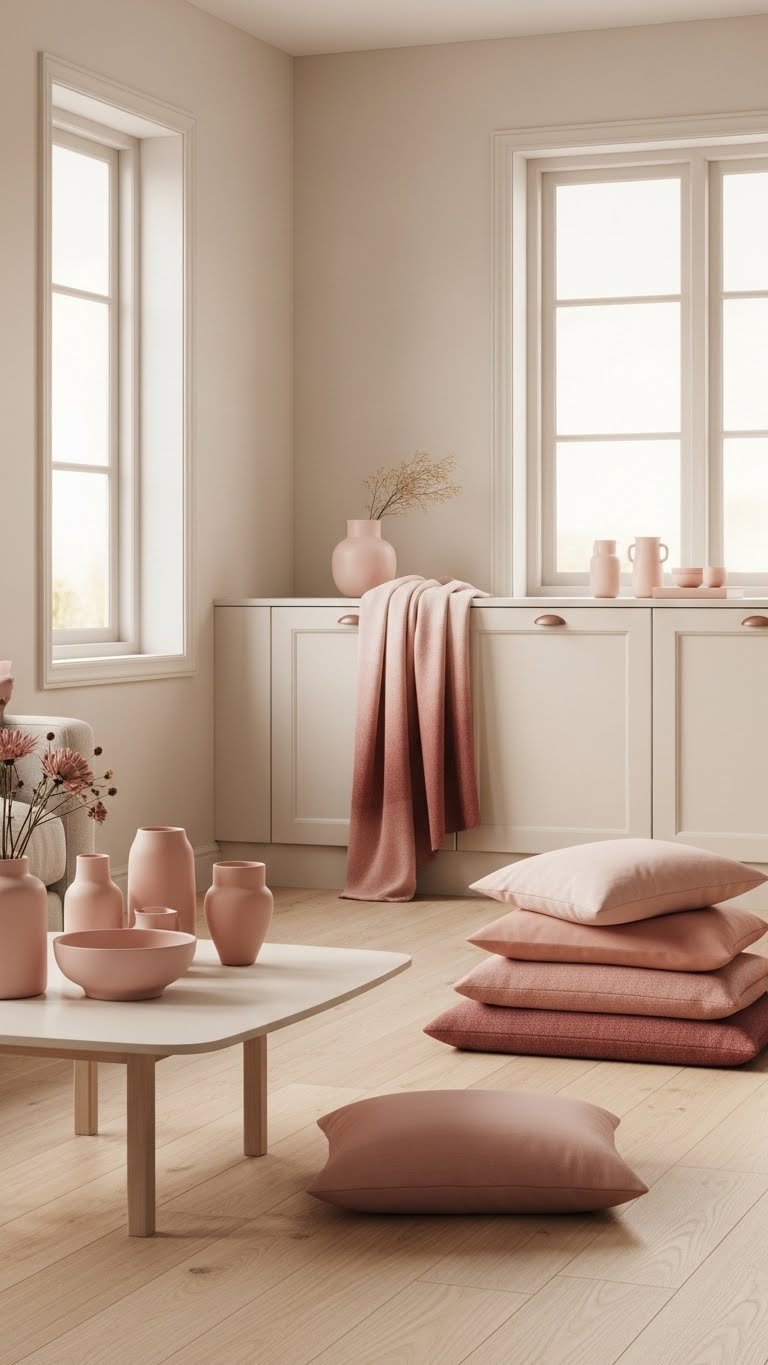 Bring in blush pink to soften a neutral scheme without stealing the show; it lifts the room with a gentle, modern warmth that reads fresh rather than saccharine. You’ll add blush matte finishes on ceramics and hardware for subtle sophistication, then layer pink ombre textiles—throws, cushions—so you can switch mood easily. Choose restrained accents to keep the space airy and liberating.