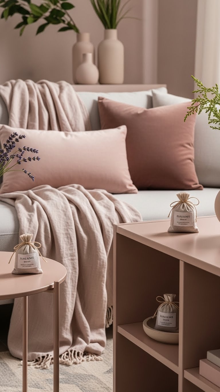 Blush pink sets a soft visual tone, and lavender-scented soft furnishings add an olfactory layer that keeps the room calm and modern rather than sweet. You’ll layer linen throws, velvet cushions and discreet lavender sachets to craft subtle pockets of scent.
