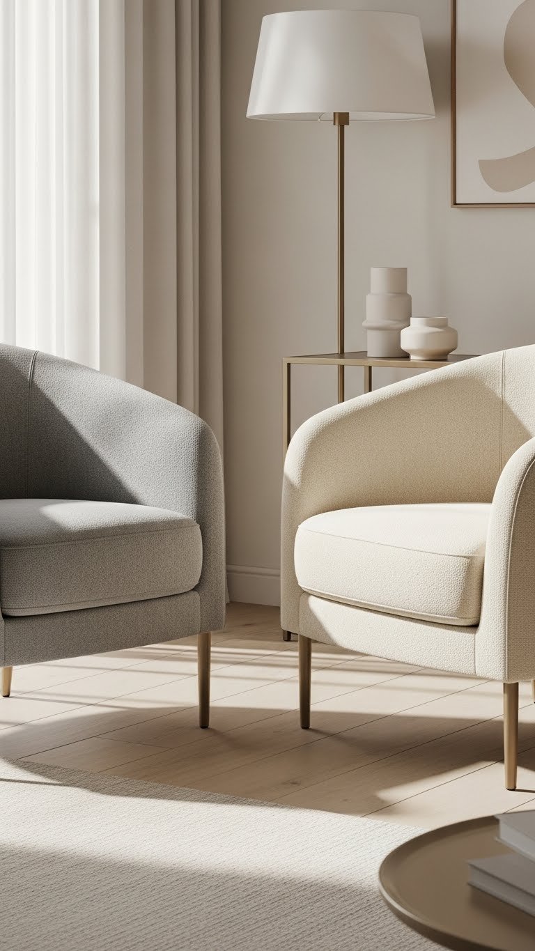 Move from a sculptural sofa to matching curved accent chairs to amplify softness and create intimate conversation zones.