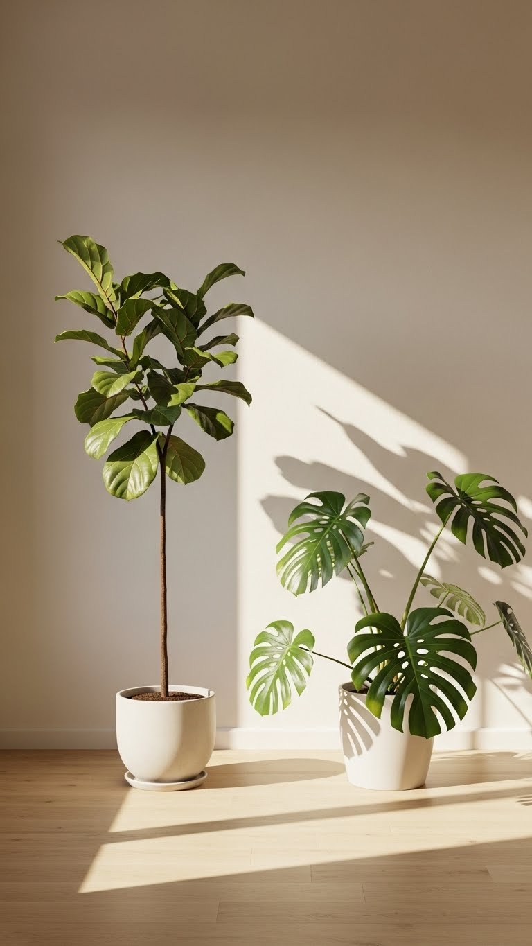 You’ll choose a tall fiddleleaf for architectural presence or a glossy monstera for dramatic cut leaves. Position near light, trim sparingly, and pair with simple pots to keep the room airy. These plants free your space while staying calmly refined.