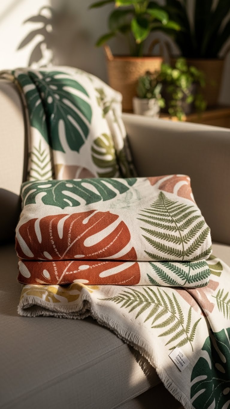 Bringing botanical prints into your textiles keeps the leafy vibe going without adding more living maintenance — think throw blankets patterned with oversized monstera silhouettes or delicate fern fronds that echo the plant’s scale and shape. You’ll pick climate friendly fibers, seasonal colorways that shift with mood, and hand stitched details for craft credibility.