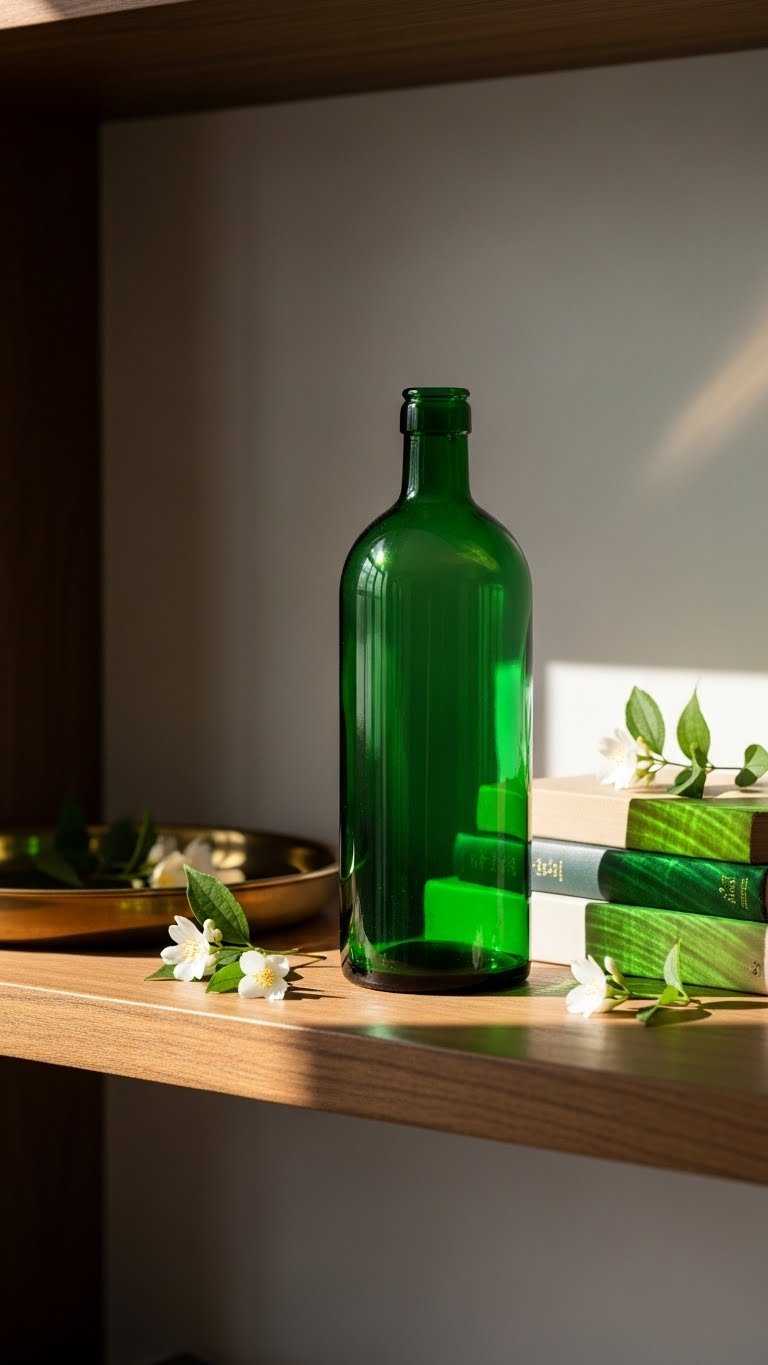 A single emerald bottle can act like a little green exclamation point on your shelf, anchoring a vignette with effortless color and old-world charm.