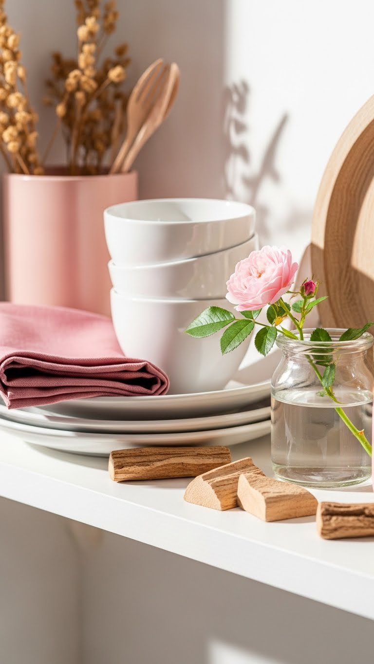 Often, you’ll lean into pink as a playful punctuation — think small, strategic pops rather than all-out pink rooms — to lift a shelf without overwhelming it. You’ll mix a blush napkin folded beside ceramics, tuck a delicate rose sprig into a jar, and pair those pops with raw wood and white ceramics. The effect feels fresh, bold, and effortlessly free.