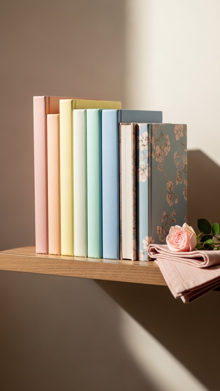 If you liked how a blush napkin and rose sprig give a shelf a playful lift, try stacking soft pastel books to continue that gentle, color-forward energy. You’ll curate ombre spines for a calm gradient, tuck in volumes with muted florals, and let texture — linen covers, paper edges — invite touch. It reads modern, relaxed, and utterly unfussy, freeing your space to breathe.
