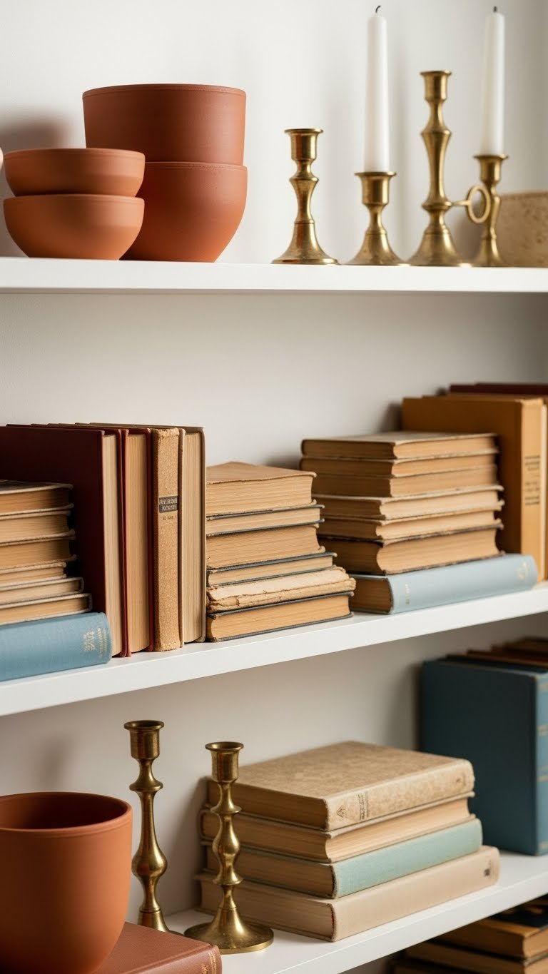 Regularly repeating a few key elements—like a pair of terracotta pots, three stacks of sun-bleached books, or a rhythm of brass candlesticks—gives your shelf an intentional beat that guides the eye and calms the composition.