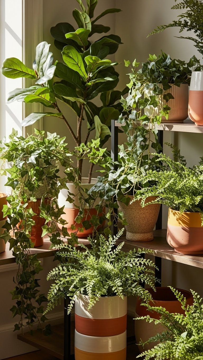You’ll create low maintenance greenery clusters that feel alive, use corner height variation for movement, and layer textured pots and warm ceramics so each shelf breathes free and intentional.