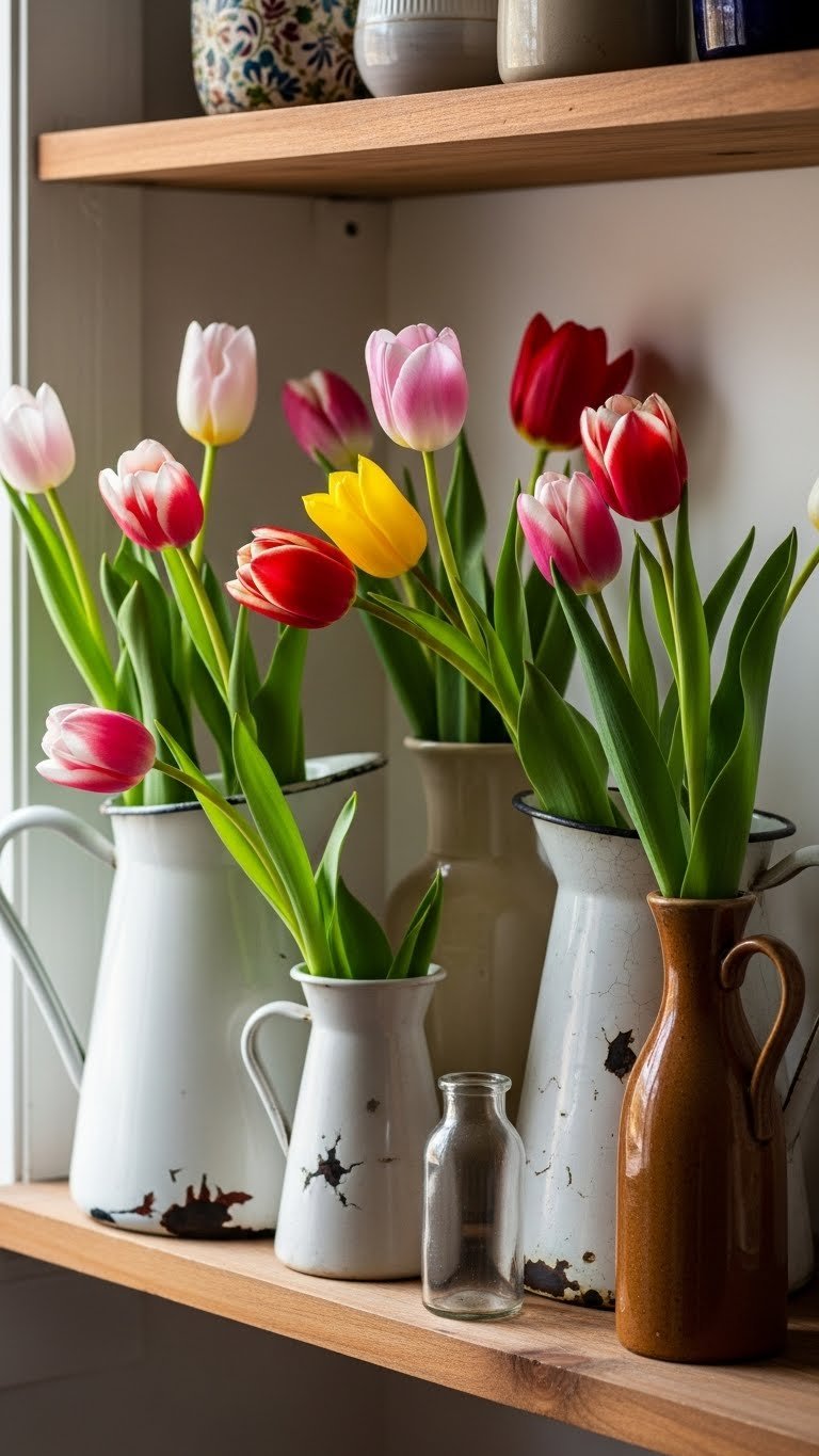 Pluck a handful of fresh tulips and tuck them into thrifted vessels to give your shelves an effortless, seasonal lift — the blooms’ crisp silhouettes and saturated colors pop against worn glazes and mismatched textures.