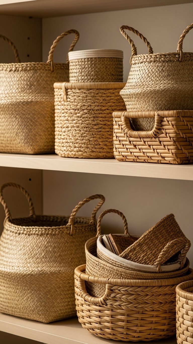 You’ll mix sizes and shapes of natural fibers, embracing neutral tones to keep things calm yet tactile. Nest baskets for depth, let handles peek, and use a few open ones for casual storage — effortless, free, and perfectly curated.