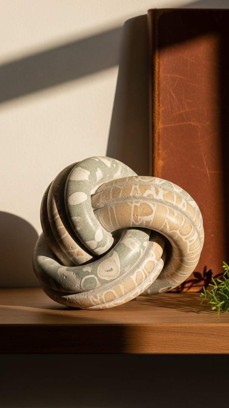 After the warm, worn feel of leather, bring in a cool, sculptural counterpoint with a limestone knot display that grounds your spring shelf in natural geometry. You’ll appreciate limestone knot origins — tactile rings, fossil whispers — and how coastal mineralogy contrasts enliven textures. Place it solo or beside greenery; it anchors airy arrangements, honest and bold, letting your space breathe and roam.