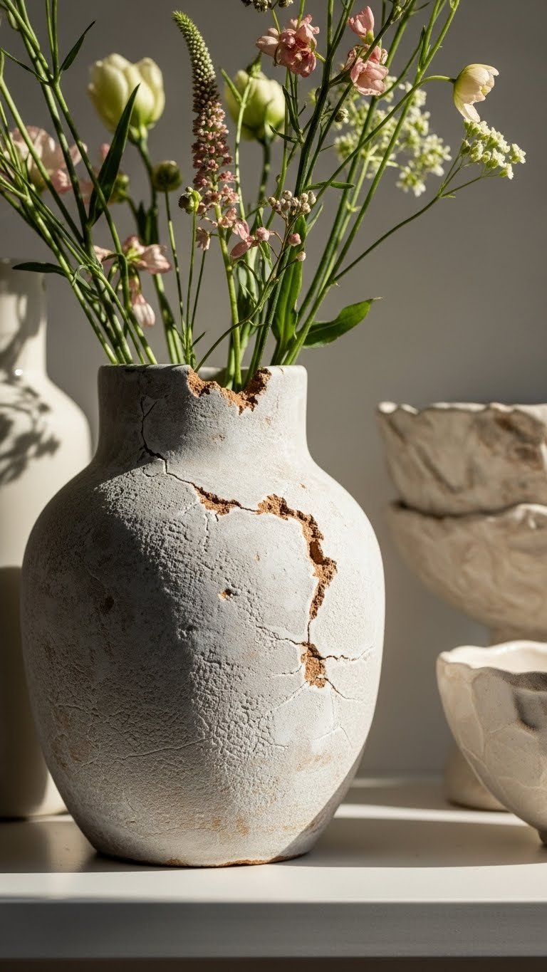 You can carry the calm, handcrafted feel of the sculpted bowls into a distressed vase arrangement that adds weathered character and contrast to your spring shelf.