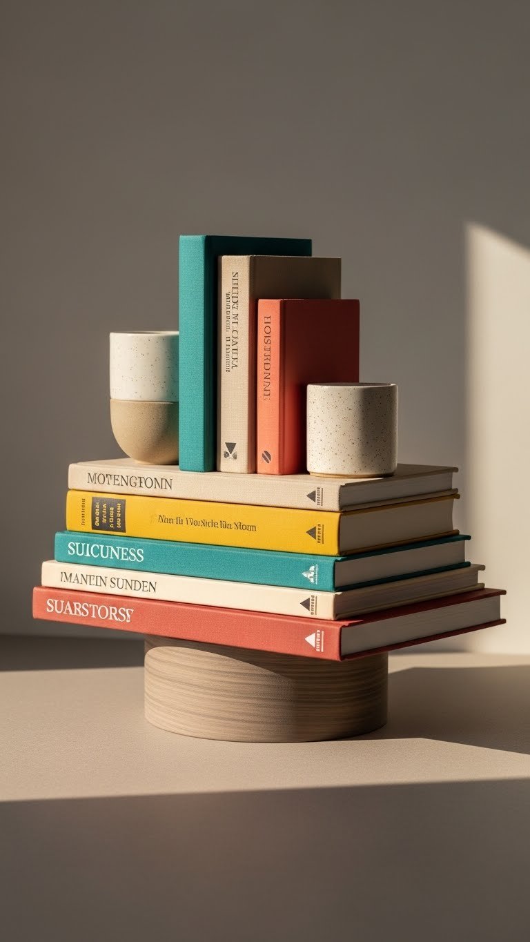 When you stack a few well-chosen books into a low pedestal, they turn ordinary objects into a layered display that feels curated and casual at once.
