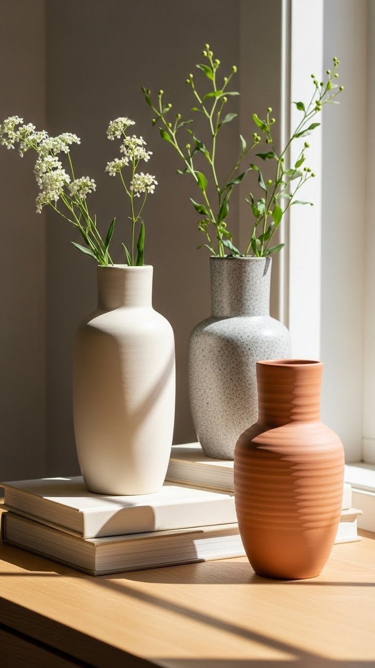 After you’ve used stacked books to anchor height and color, bring in a trio of vases to add rhythm and tactile contrast—three shapes that speak to one another without matching.