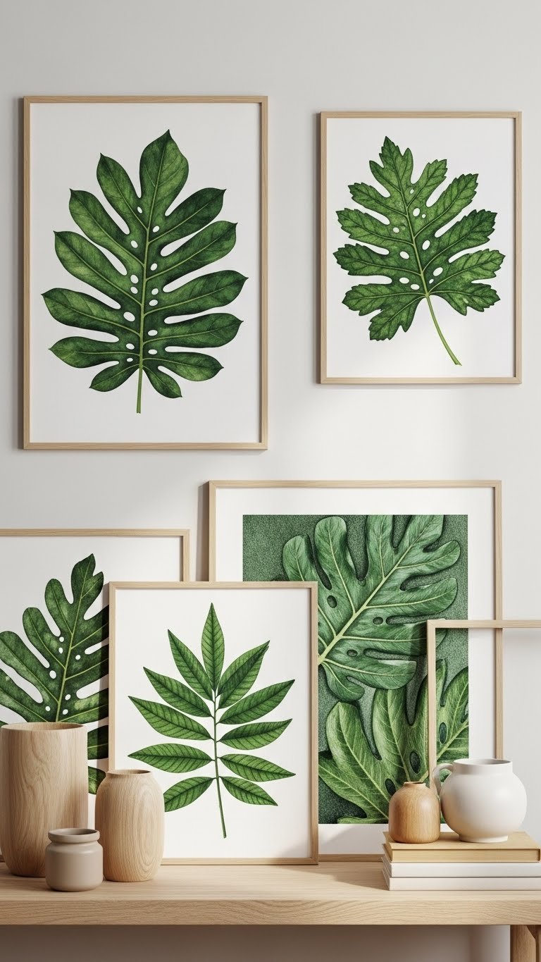 You’ll love how oversized foliage illustrations command attention, their textures and verdant hues enlivening air and mood. Balance bold color with neutral objects, minding frame scale so pieces don’t compete.