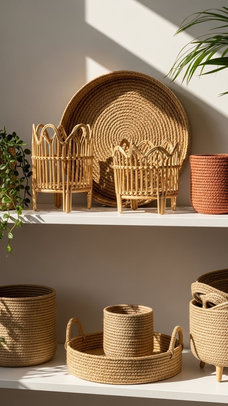Bring in rattan and jute to add instant tactile warmth to your shelf — their woven textures catch light and invite touch, grounding the space with an easy, sunlit vibe.