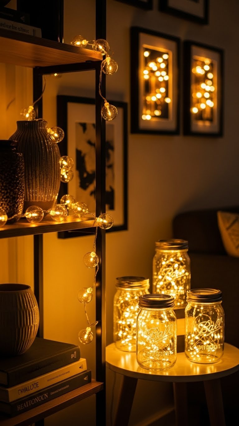 Often, you’ll reach for delicate string lights when you want an instant, soft glow that feels both cozy and modern. You’ll twist fairy bulbs along shelves, favoring warm filament for an amber, tactile warmth. Try a draped mason jar cluster or hidden battery strands behind art to highlight textures. The effect’s effortless, freeing your space while keeping it intimate and stylish.