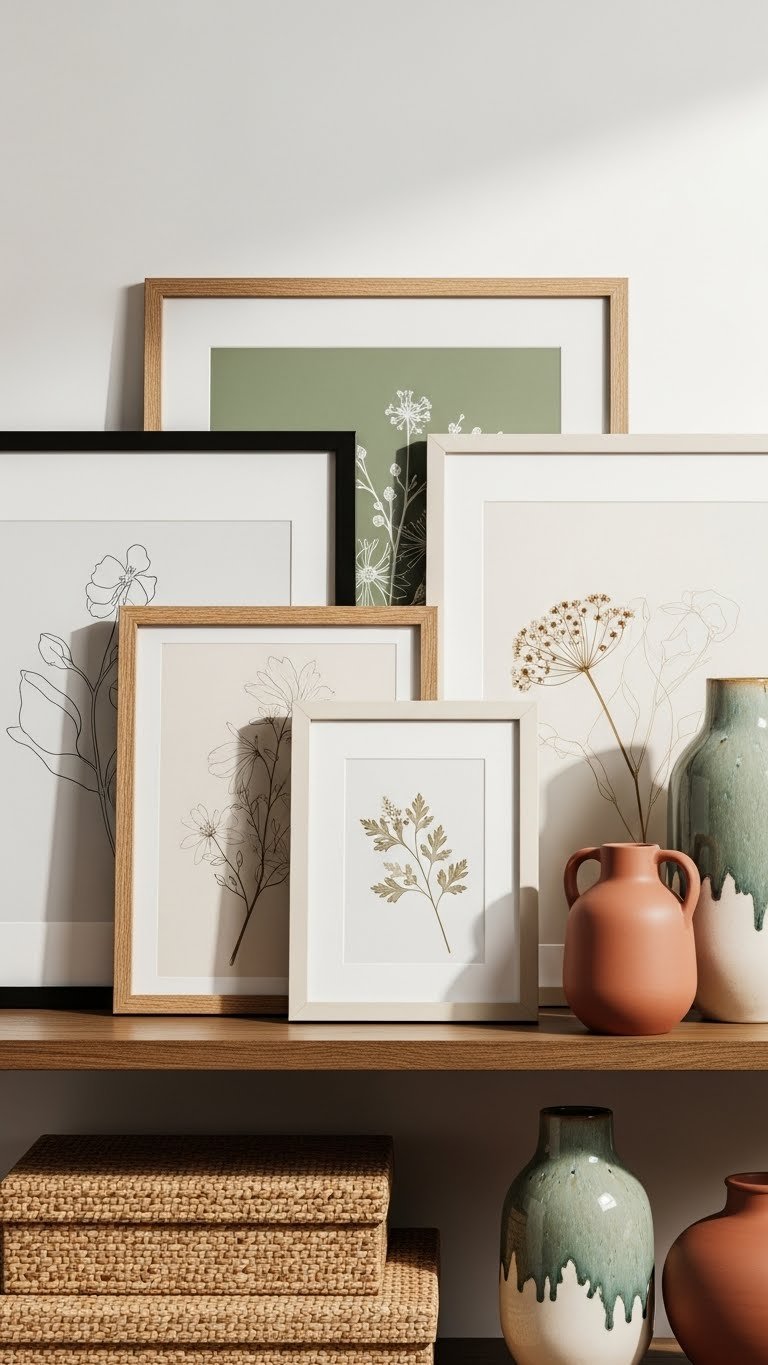 You’ll mix minimalist linework prints with delicate pressed florals for texture and honesty, leaning into neutral frames that let forms breathe.