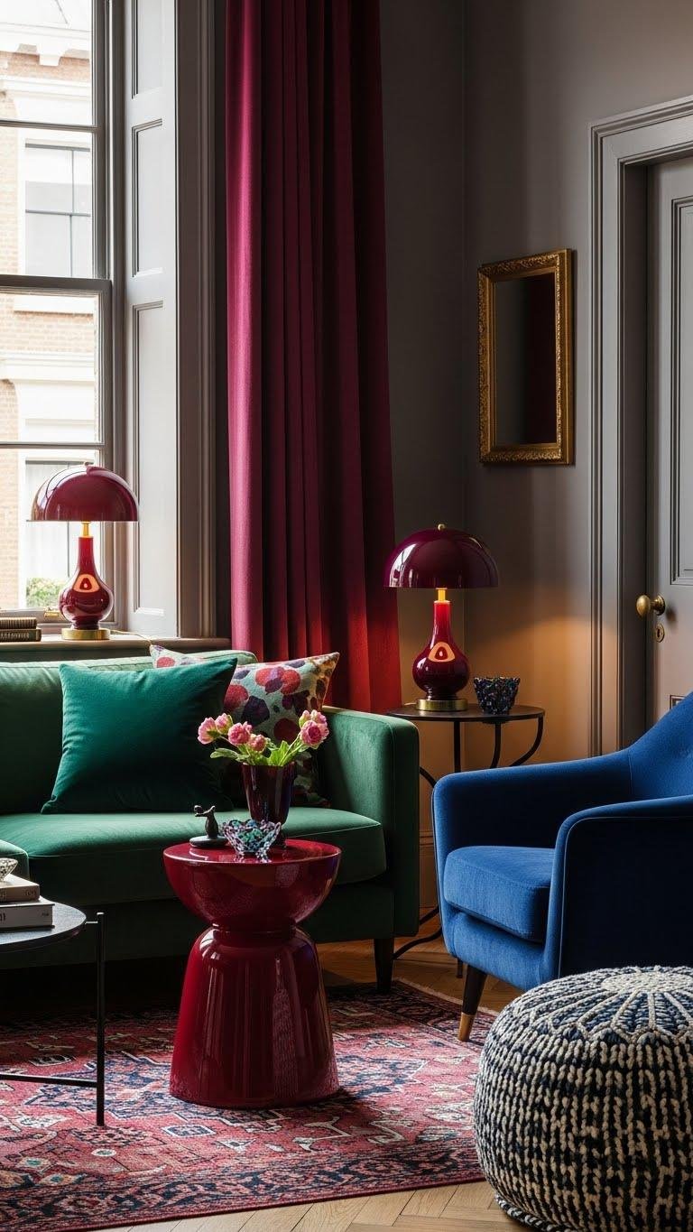 Start with one bold piece and build around it: choose a jewel-toned sofa, armchair, or rug as your anchor, then layer complementary hues in smaller doses—velvet throw pillows, a lacquered side table, or an artful pouf—to create depth without clutter. You’ll place a velvet pouf, balance with jewel lamps for mood, limit patterns, and edit accessories for liberated, curated impact.