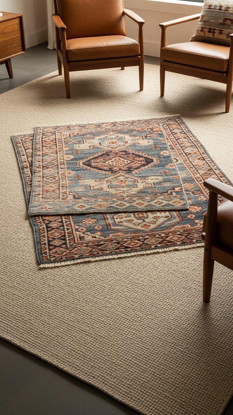 Layer layered rugs to add instant depth and pattern without overcomplicating the scheme: start with a large, neutral foundation rug for scale, then place a smaller, patterned or textured rug offset on top to create a focal plane.