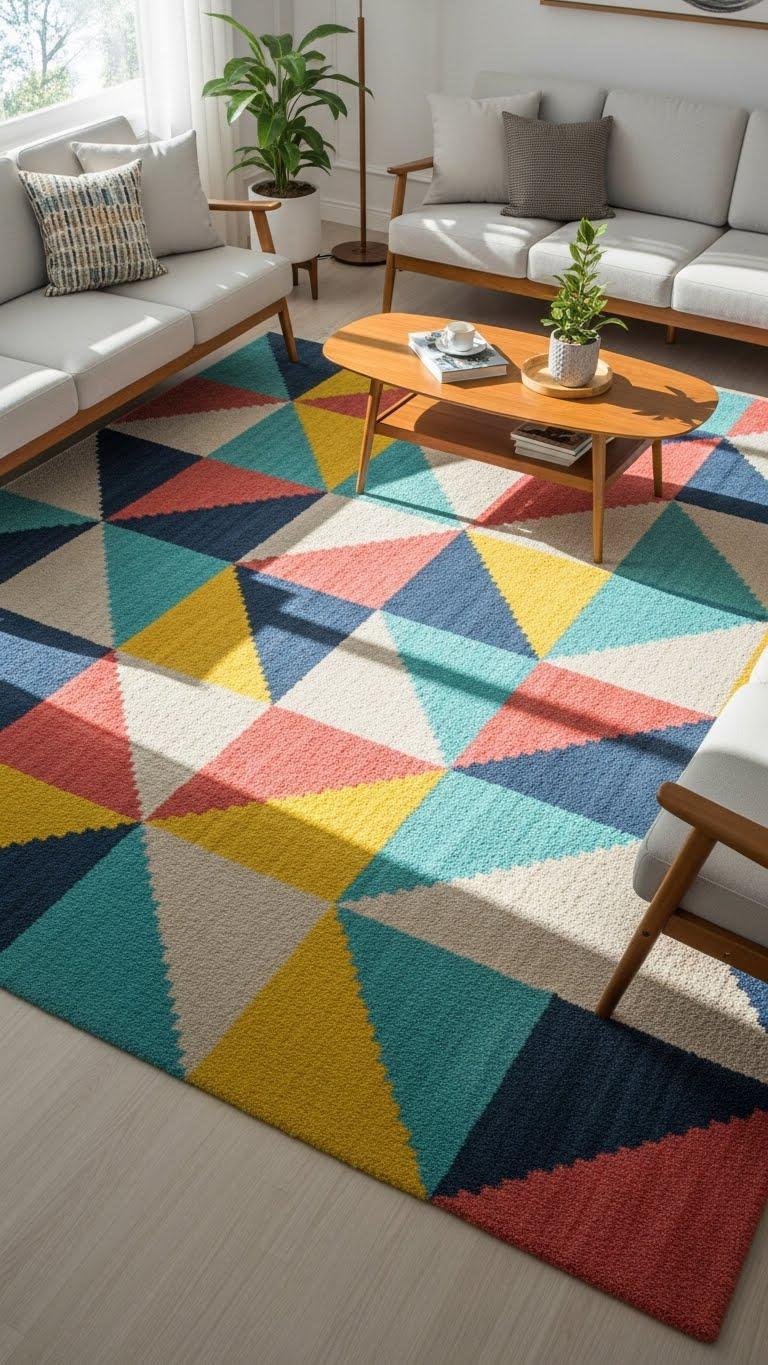 A bold geometric rug can redefine your living area, instantly introducing rhythm, scale, and color so the room reads as intentional and curated.