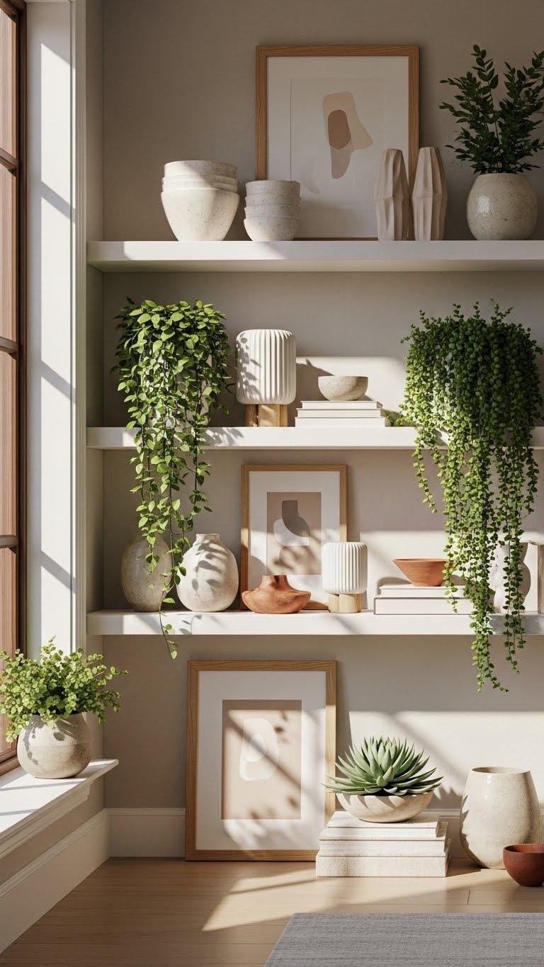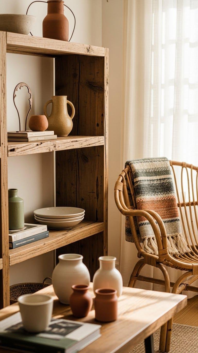 Bring in natural materials and handcrafted pieces to ground the room and give it unmistakable personality. You’ll choose reclaimed wood shelving, a simple rattan chair, and handmade ceramics as focal accents.