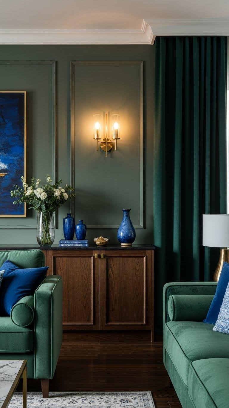 When you anchor a palette in deep, verdant greens, gold and sapphire accents sharpen the scheme into something richly composed and intentional. You’ll pair emerald upholstery with brass trim to create luxe contrast, introduce sapphire accents via pillows and art, and ground the room with dark wood cabinetry. The result feels liberated, refined, and decisively modern without excess.