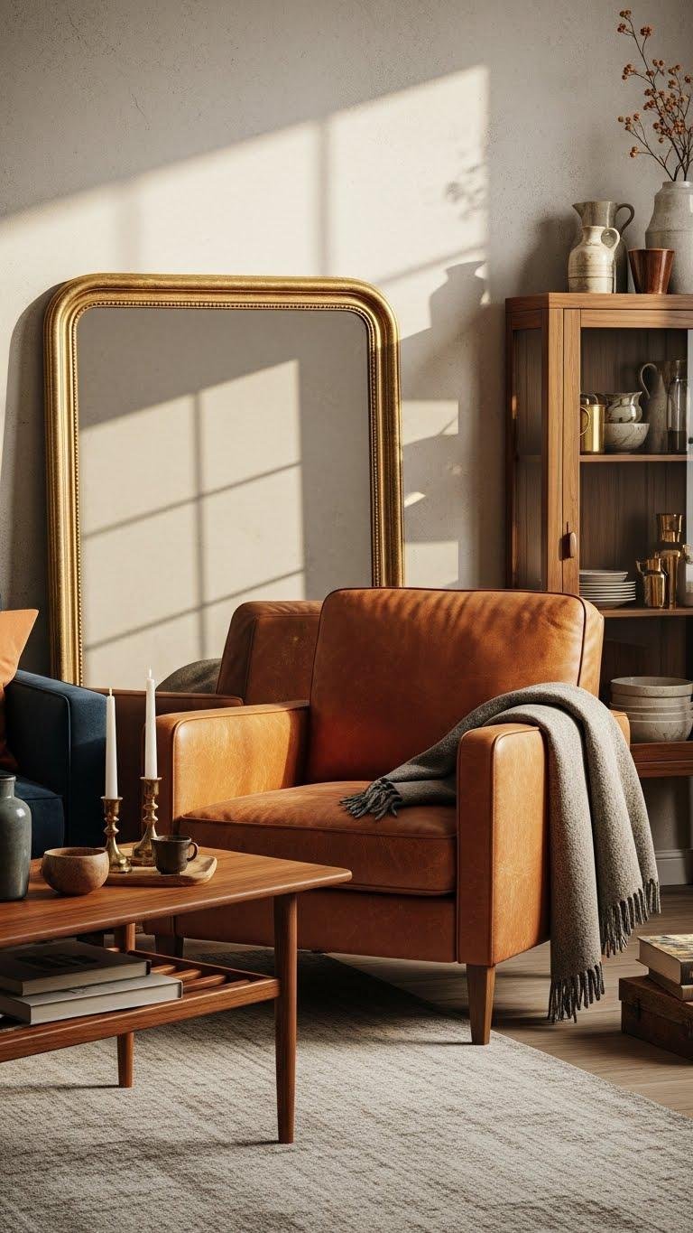 If you want your living room to feel layered and lived-in, introduce a few genuine vintage pieces to anchor the space—an aged leather armchair, a mid-century coffee table, or an antique mirror instantly add depth and provenance.