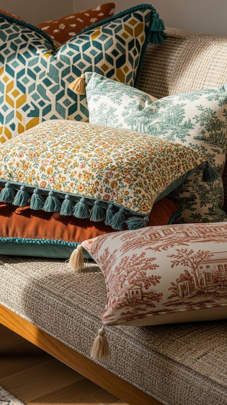 Although layering patterned cushions might seem bold, you can craft a cohesive, eclectic look by balancing scale, color, and texture. You’ll mix contrasting prints—large geometrics with small florals—anchor with a unifying hue, and vary tactile trims for depth. Arrange asymmetrically for effortless freedom, rotate cushions seasonally, and keep proportions intentional so the result feels curated, confident, and lived-in.