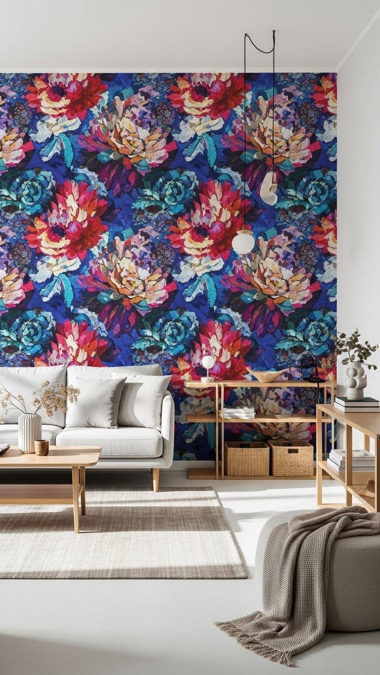 Make a statement with bold wallpaper and let neutral furnishings do the balancing act: dramatic patterns or vivid colors anchor the wall while streamlined sofas, muted rugs, and timber accents calm the room and keep the focus intentional.