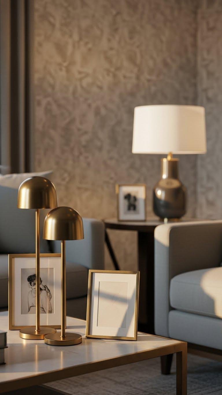 Pull the eye from patterned walls to subtle gleams by introducing metallic accents that warm and ground the room. You’ll choose warm metals sparingly—lamp bases, picture frames, a coffee table edge—in brushed brass to anchor textures without overpowering.