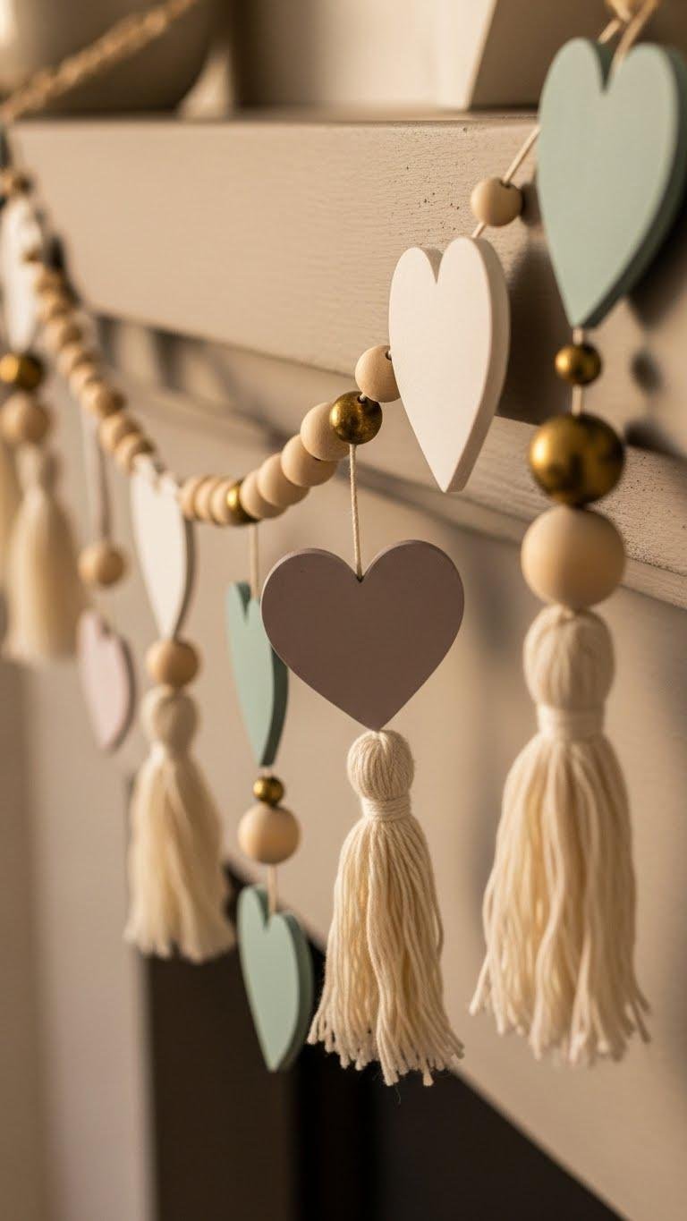 Across your mantel, a beaded hearts and tassel wood garland adds playful texture and modern warmth—string matte-painted wooden hearts with natural bead spacers, intersperse soft cotton tassels, and let a few brass or gold-painted beads catch the light. You’ll drape the wooden garland casually, mix lengths for movement, and use beaded tassels to add rhythm and liberated, chic charm.