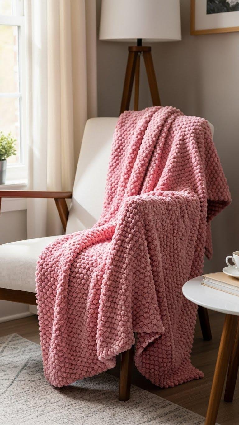 Chenille Pink Throw Blanket on a Reading Chair