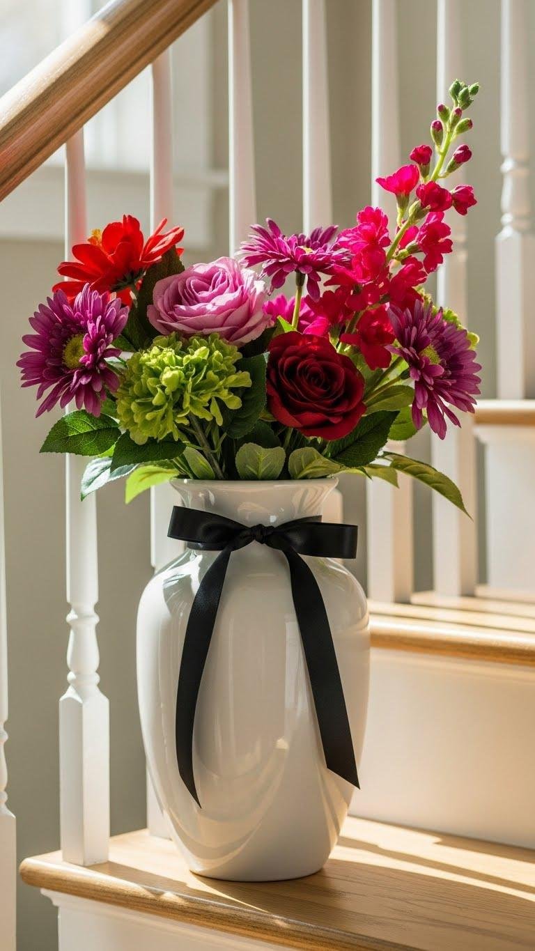 If the heart garland brightened your stairwell, carry that playful color into a fresh focal point with a glossy ribbon vase filled with blooms—real or faux.