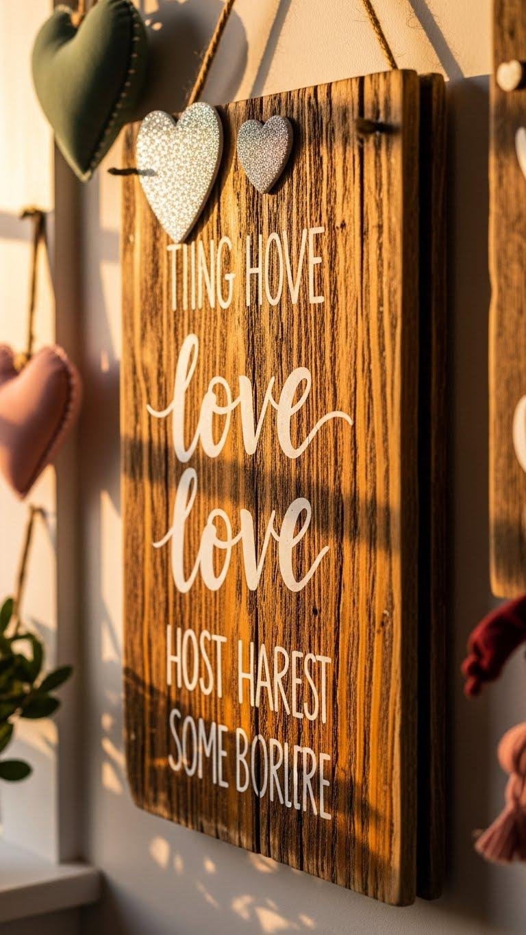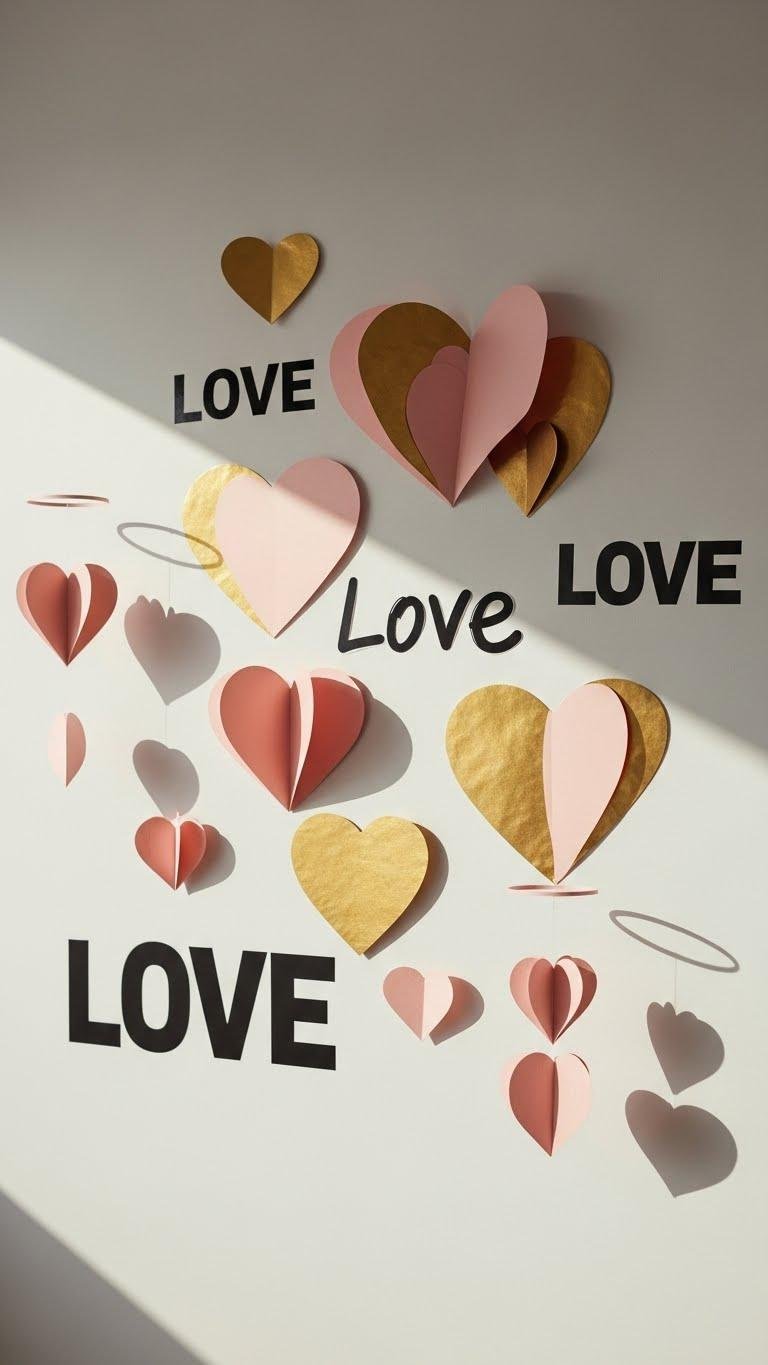 Cut out paper hearts or peel-and-stick “Love” phrases to instantly lift a wall from bland to beaming — mix sizes, papers, and fonts for a layered, modern look that feels curated, not kitschy.