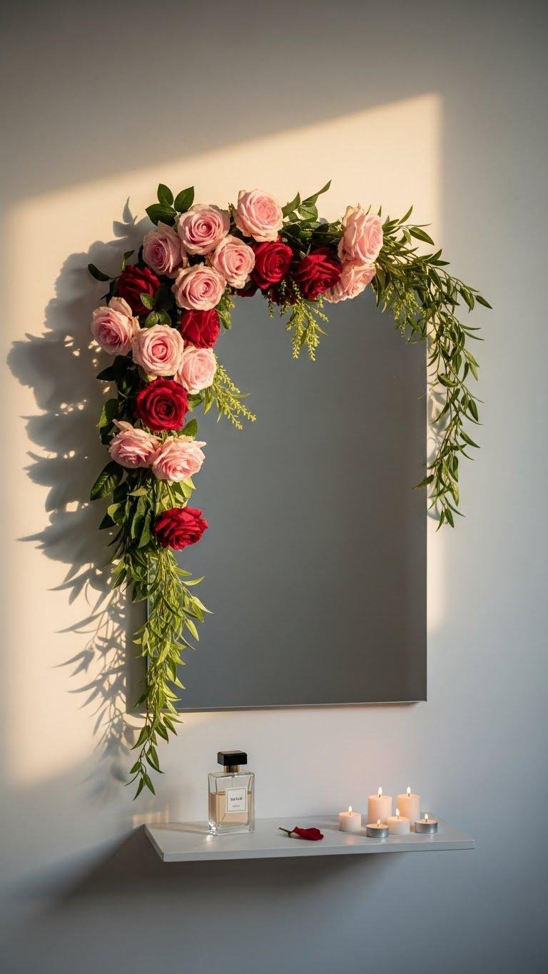 A soft floral garland of pink and red roses draped over a mirror instantly frames your reflection with romantic charm. You’ll create rosy symmetry by alternating hues and greenery, keeping the look modern and effortless.