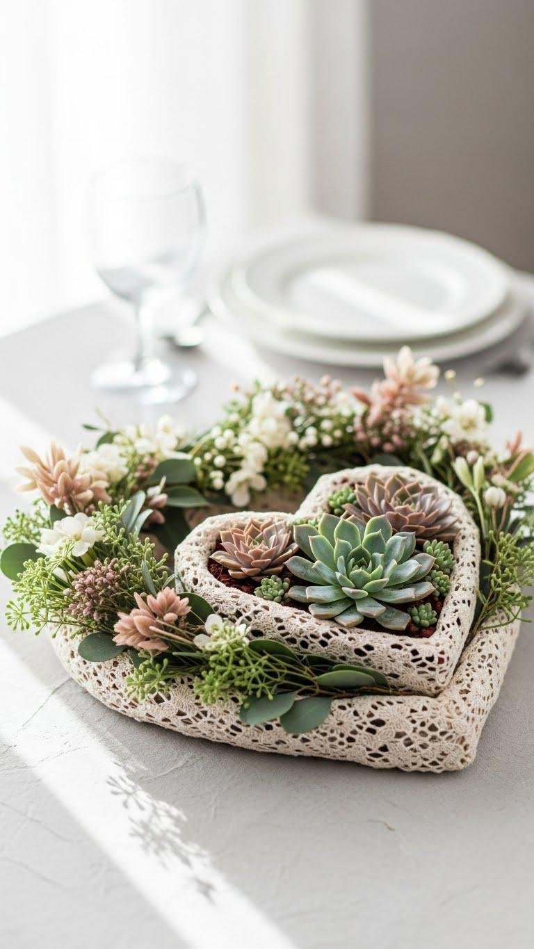 Romance becomes tangible when you center your table with a heart-shaped wreath that’s equal parts modern and whimsical. You’ll pair a vintage lacewreath base with airy greenery, layering a low-profile succulent heart at the center for texture and edge.