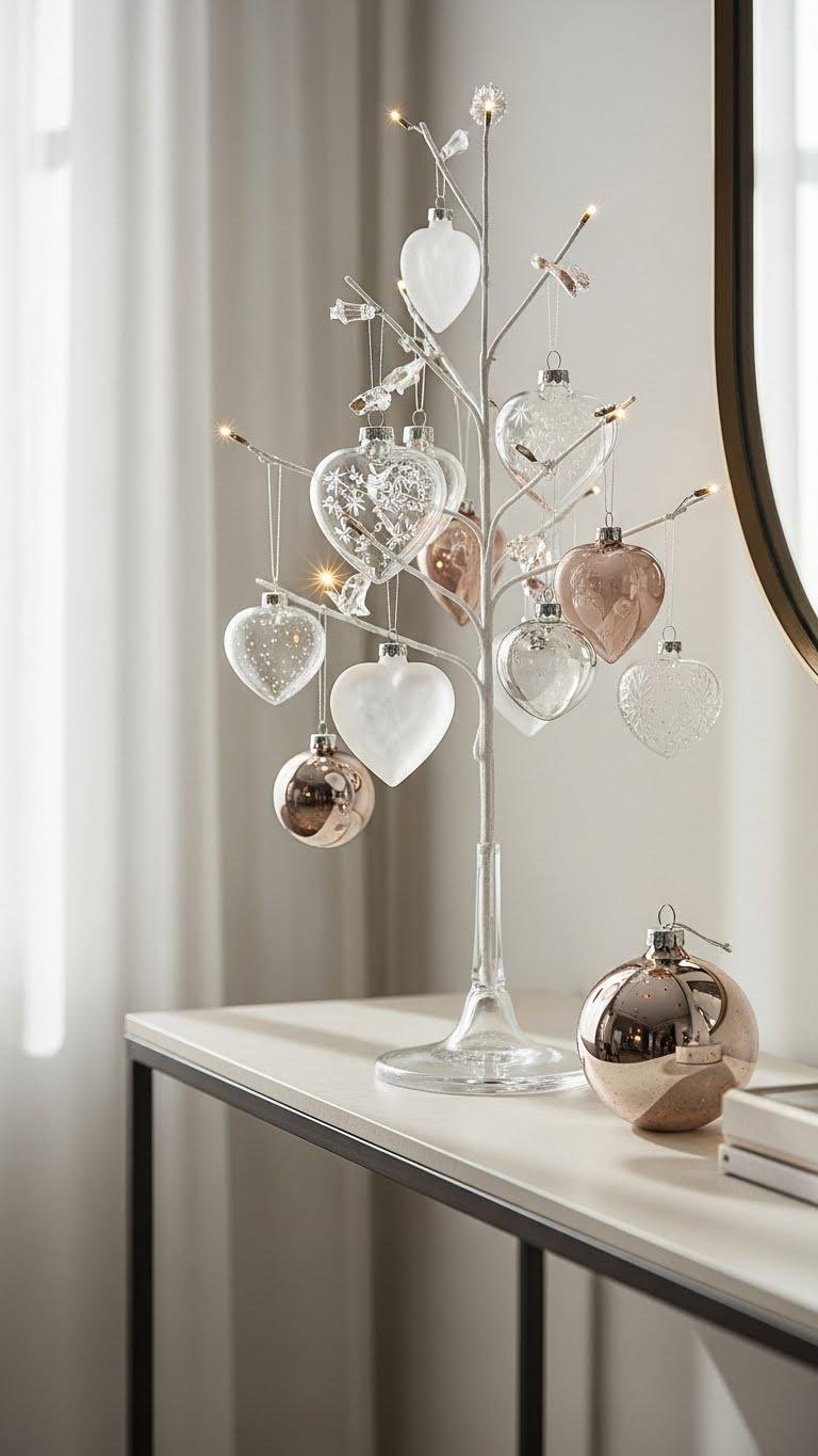 Picture a slim console tree dressed in delicate glass hearts that catch the light and lift the whole vignette — hang varying sizes and finishes (clear, frosted, and pale blush) at staggered heights so each ornament reads like a small, intentional accent rather than clutter. You’ll mix etched hearts with a few mercury glass pieces for contrast, keeping the look airy, modern, and effortlessly free.