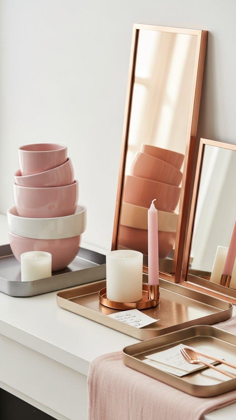 After you’ve layered pink-and-white pottery on the mantel, introduce rose gold in trays and frames to lift the look with soft metallic warmth. You’ll place metallic trays to corral candles and love notes, and lean framed mirrors for light and openness.