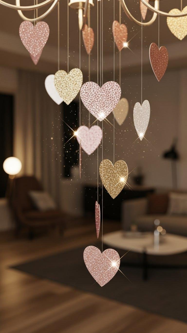 Drape glittered heart cutouts from your chandelier to give the room an instant dose of playful glamour. Hang varied sizes on clear thread, spacing for chandelier balance and airy movement. Use subtle glitter tips—apply sparingly at edges for refined sparkle. You’ll keep the look modern and free-spirited, letting light and motion create a chic, flirtatious focal point without overwhelming the space.