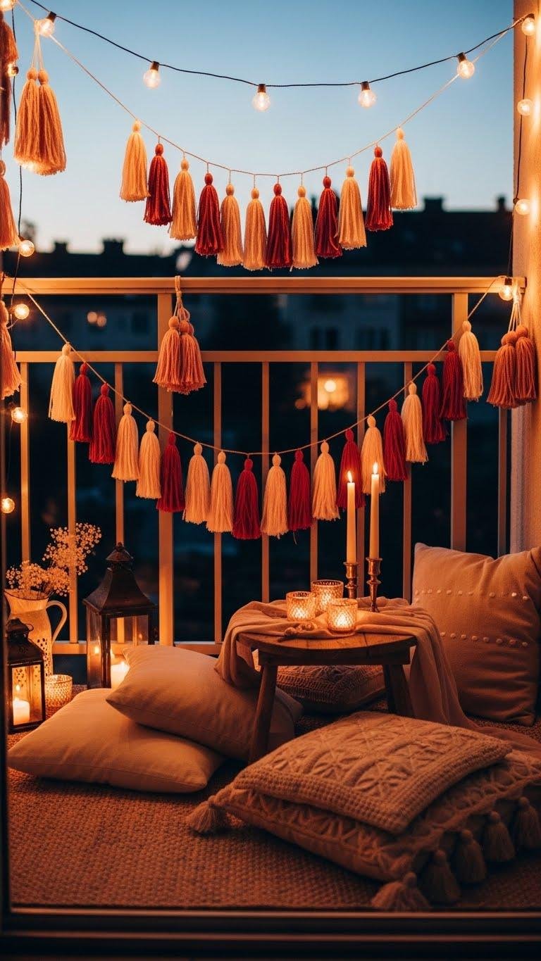 Turn your balcony into a cozy, twinkling hideaway by weaving warm string lights with playful tassels—think soft bulbs, matte tassel bundles in blush and terracotta, and a few lanterns for depth—so every corner feels intimate and photo-ready. You’ll hang bistro lights, mix in a tassel DIY garland, add low pillows and a small table, and claim a liberated, romantic nook.