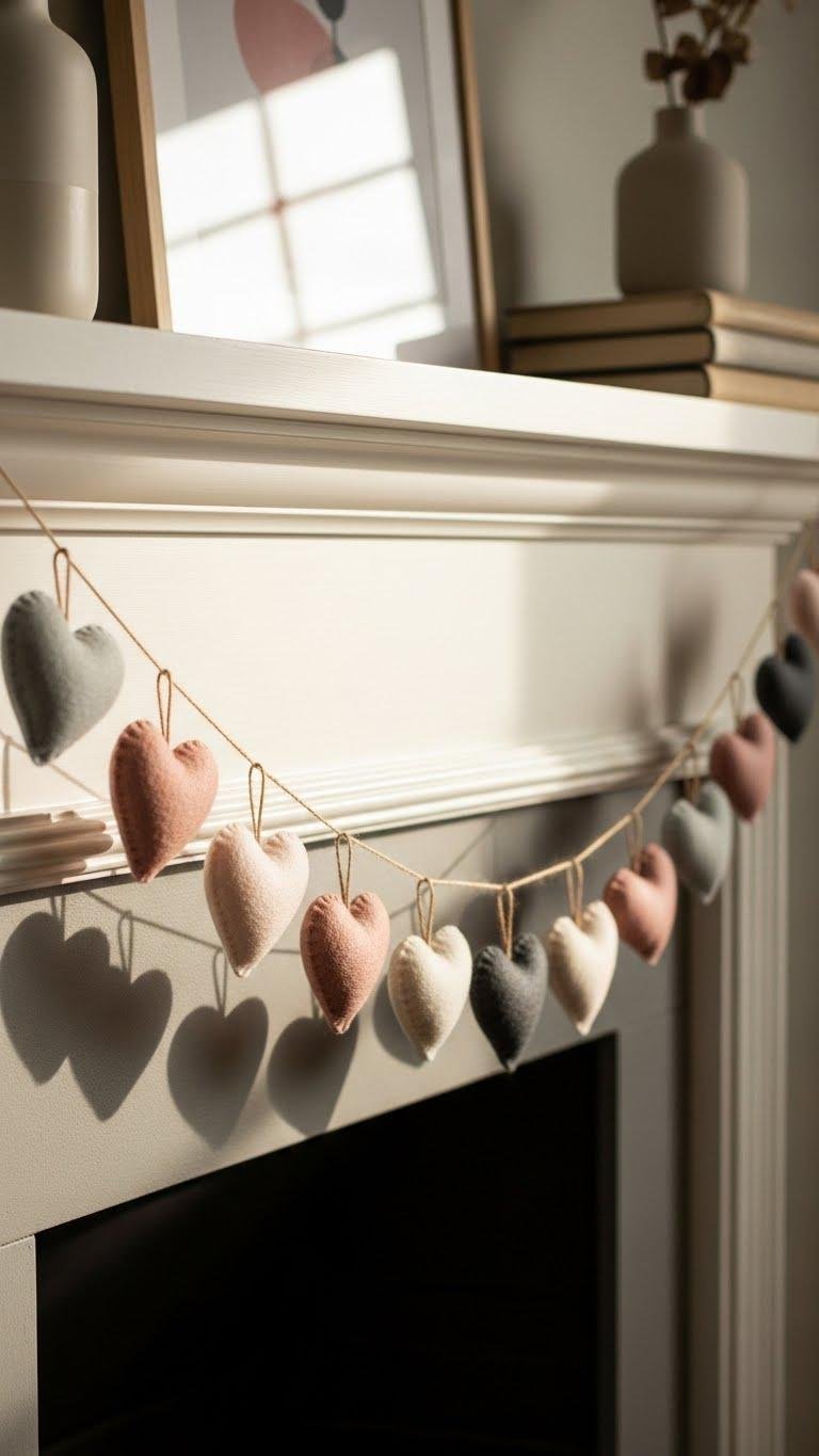 If you loved the glass-heart poise on the console, bring that same refined touch to your mantel with a felt heart garland that feels both modern and handmade.