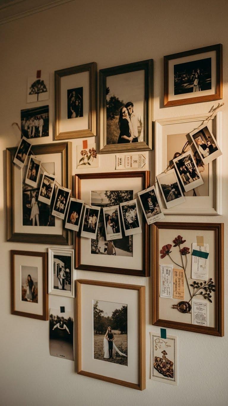 Start by layering your favorite moments into a compact, eye-catching display that feels personal and polished. You’ll mix a polaroid garland with clustered vintage frames, arranging candid shots, ticket stubs, and tiny mementos. Hang at varying heights to keep energy flowing, use neutral mats for cohesion, and let the wall breathe — stylish, liberated, and effortlessly intimate without overcrowding the room.
