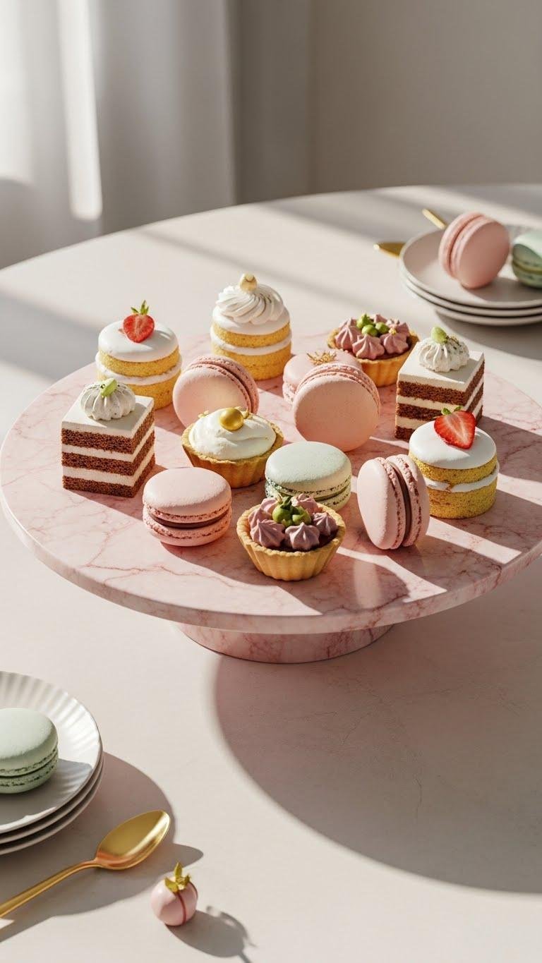 A pink marble cake stand turns ordinary sweets into a chic centerpiece that feels both luxe and approachable.