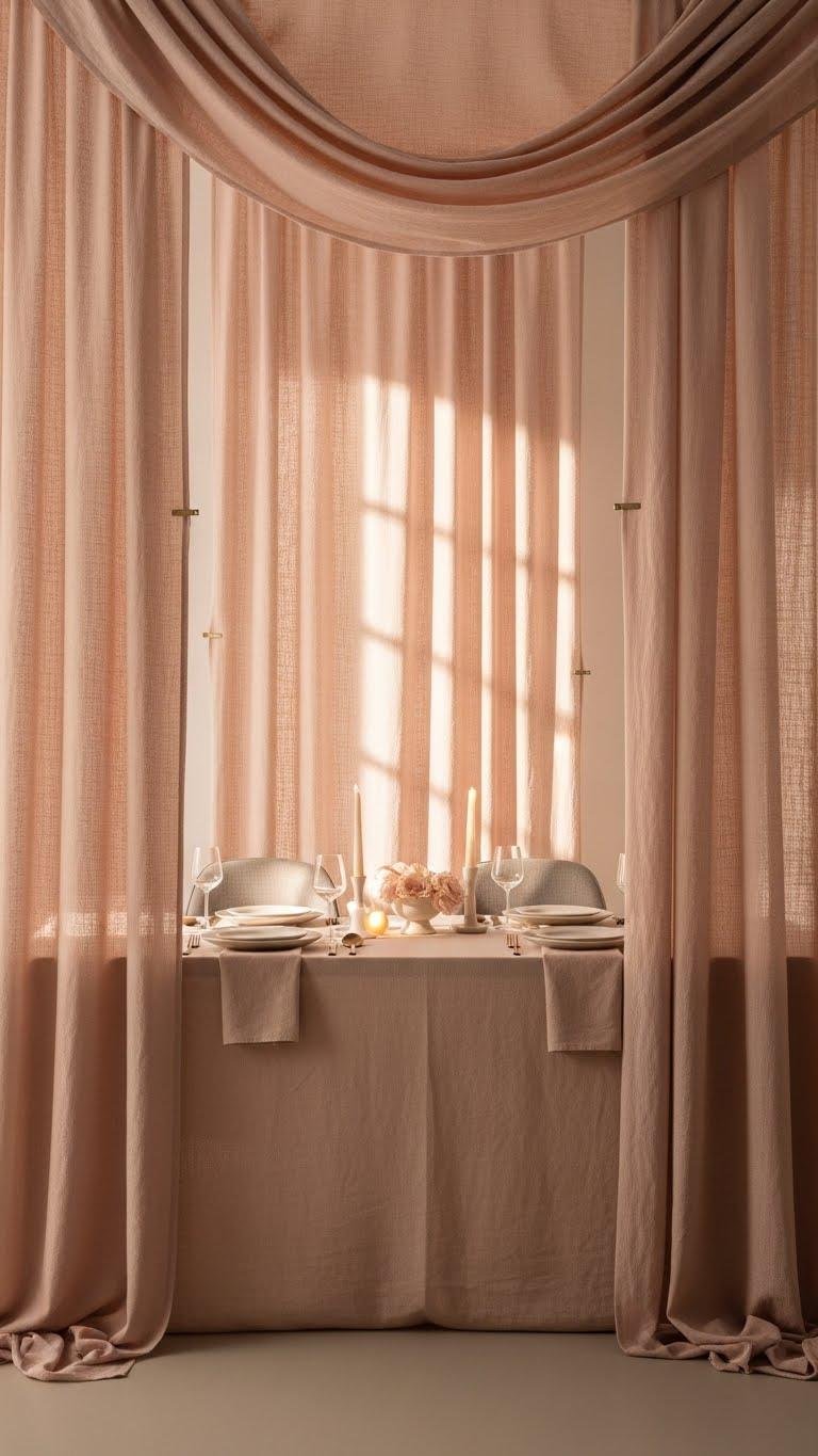 You’ll love the textured blush effect—linen draping that breathes, catches light, and adds subtle movement. Keep lines clean, anchor fabric with minimal clips, and let the palette whisper romance so your space feels open, intentional, and free.