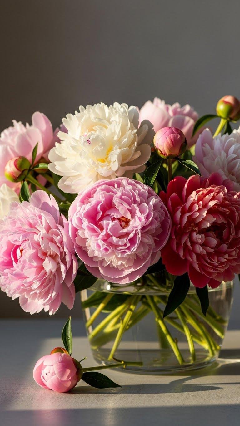 Soften the table’s look with a dreamy peony bouquet that reads like a sigh of spring—lush, layered blooms in blush, cream, and coral packed into a low, wide vase. You’ll arrange varied open and budded heads, trim stems for balance, and let peony perfume lift the meal. Place it off-center, as if returning from a quiet garden stroll, effortless and liberated.