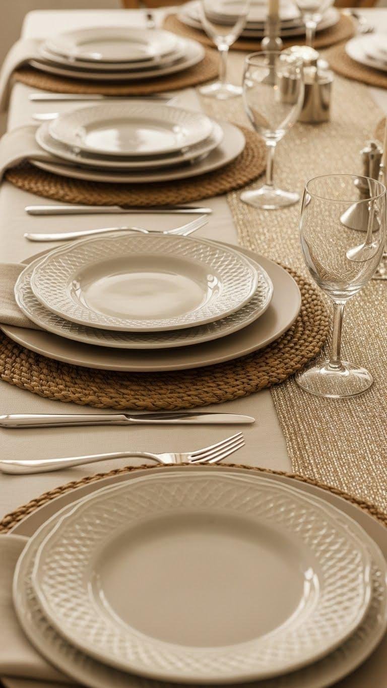 Pairing that metallic-threaded runner with layered textured placemats and charger plates gives your table depth and intentionality without fuss. You’ll mix woven jute rounds under neutral chargers, then top with embossed ceramic salad plates for contrast. Keep color minimal, let textures speak, and allow place settings to feel curated yet easy—so guests relax and you stay free to enjoy the evening.