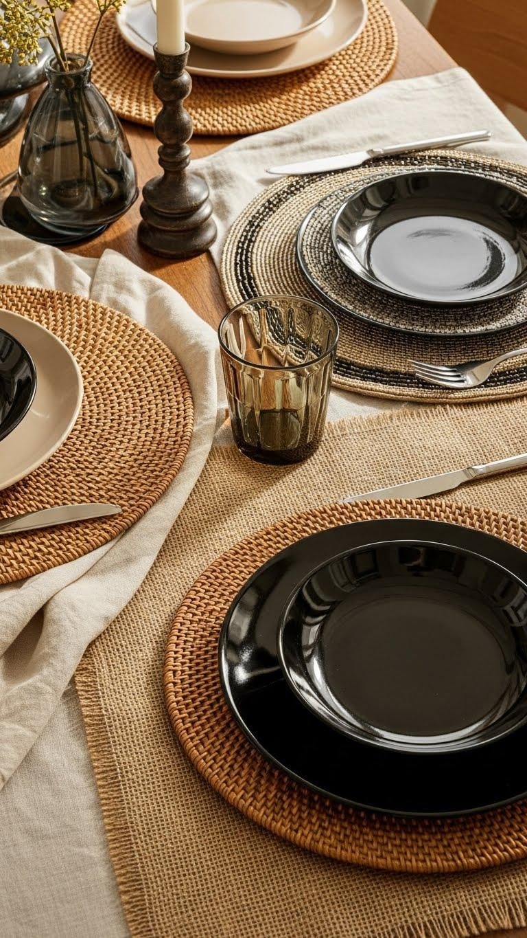 After soft linens and rough burlap set the scene, swap in rattan, beaded, or lacquered placemats to change the table’s personality without losing that handmade warmth. You’ll love the woven texture and natural hues anchoring each setting; beaded pieces add sparkle while lacquered ones offer a glossy finish. Mix them for modern contrast that feels liberated, curated, and effortless.