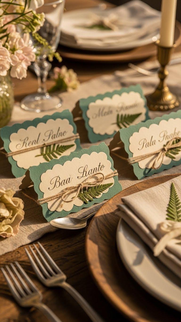 When you tuck a scalloped card tied with twine at each plate, you instantly give the table an heirloom feel that’s both romantic and lived-in. You’ll handwrite names in antique script on tea dyed cardstock, press a tiny fern leaf inside, and finish each piece ribbon tied or twine-wrapped. The look feels free, intimate, and effortlessly curated for lingering conversation.