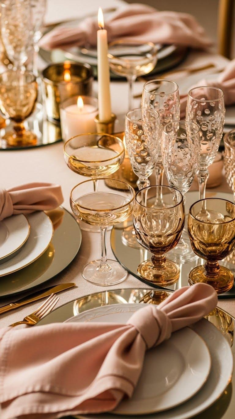 To lift those soft pink napkins into something a little more glamorous, introduce champagne gold glassware for a polished, cohesive sparkle. You’ll mix gold rimmed coupe glasses with bubble stemmed flutes, pair vintage tinted tumblers for personality, and place mirrored accented chargers to bounce candlelight. The result feels liberated, elegant, and effortlessly celebratory without fuss.
