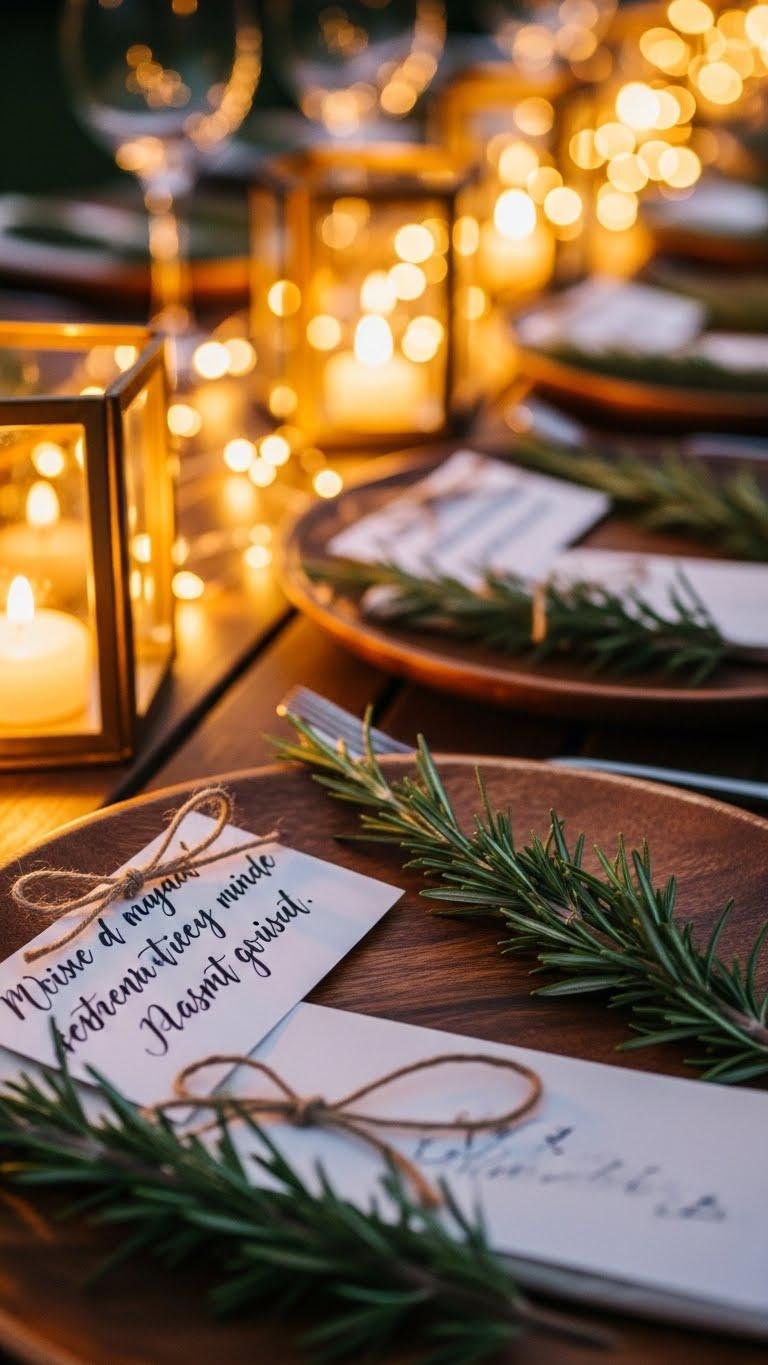 After the fairy lights and lanterns set the mood, add a personal touch with handwritten note cards tucked beside each plate and finished with a sprig of rosemary. You’ll choose scented stationery that invites and calms, pen a short, daring line, then tie an heirloom rosemary sprig with twine. It feels intimate, effortless, and perfectly free-spirited.